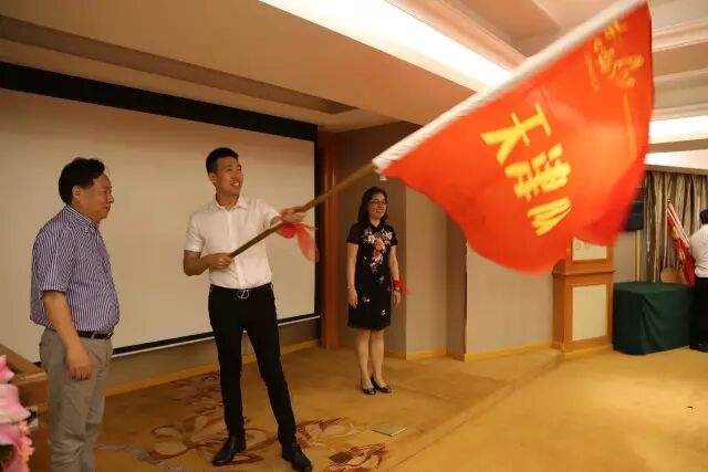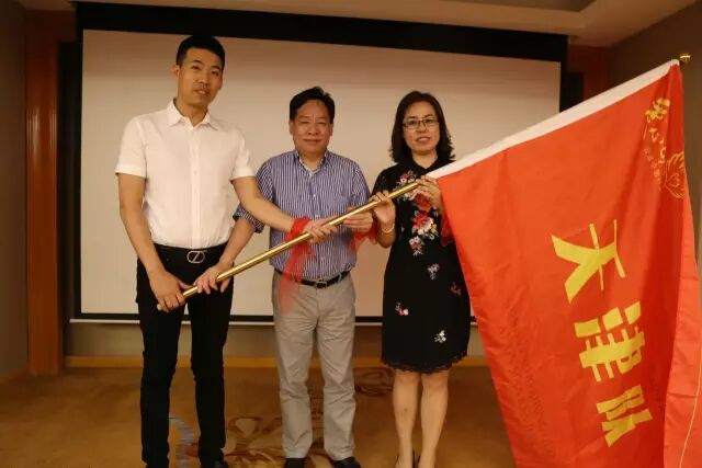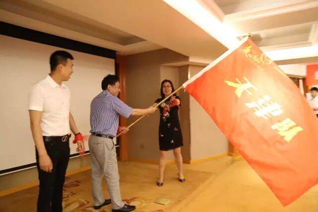 李梅、包文学为“飞之队”授旗,天津瑞澄大药房连锁有限公司、塘沽分会接旗。