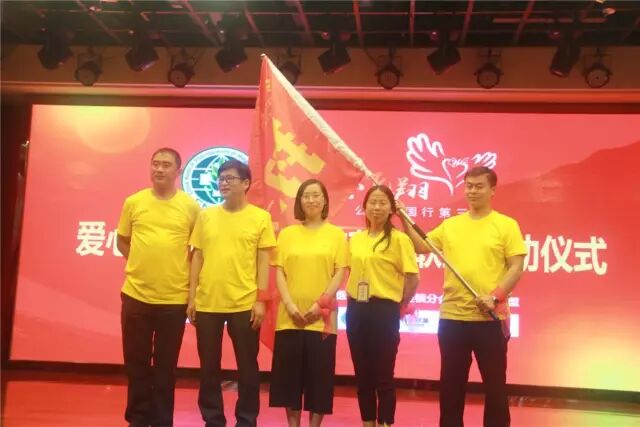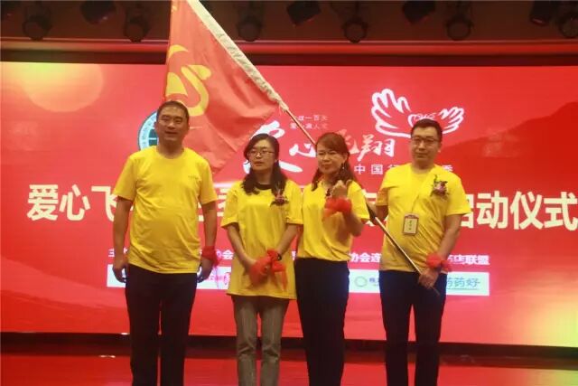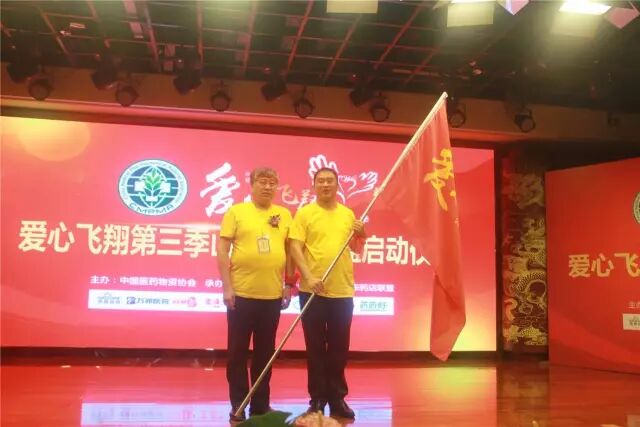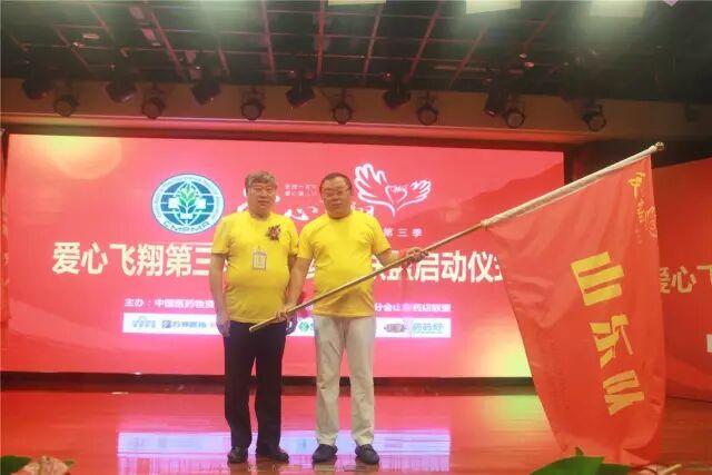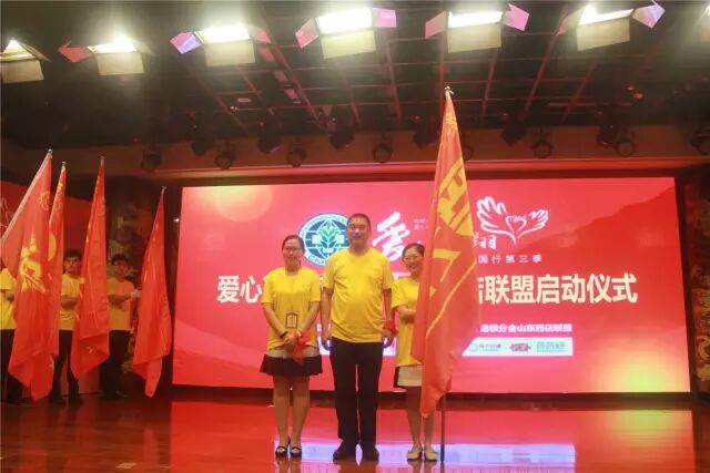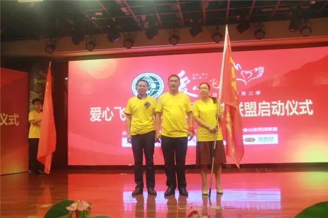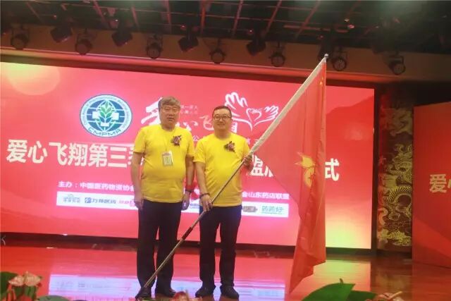 李文杰向于志刚授“爱心飞翔”旗帜,向刘焕高授山东省省队队旗,向程兴强授联合战队队旗;于志刚向山东地区参与活动的医药连锁企业代表授予山东省爱之队队旗、心之队队旗、飞之队队旗、翔之队队旗;程兴强向参与活动的成长型医药企业代表授予联合战队队旗。