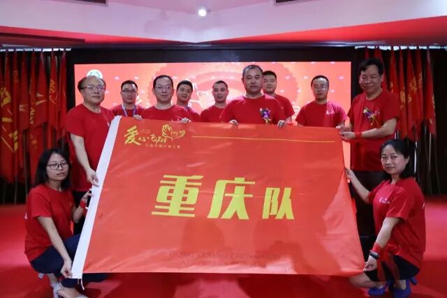 在李广军主持的爱心飞翔第三季(重庆)分会启动仪式环节,刘忠良、张忠山为成长药店(重庆)会分授“重庆队”队旗,易龙、王岩峰上台接旗。山东宏济堂制药集团股份有限公司大区总监田春升、江苏万邦医药营销有限公司地区经理谭亚名、石药集团欧意和销售公司大区总监苏先兵、杭州核力欣健实业股份有限公司大区总监王延峰、龙宝参茸股份有限公司大区总监王国立、药药好药药好(杭州)网络科技有限公司采购总监虞亦斌、贵州联盛药业有限公司地区经理葛代银等“7+1”工业企业代表出席启动仪式并作见证。