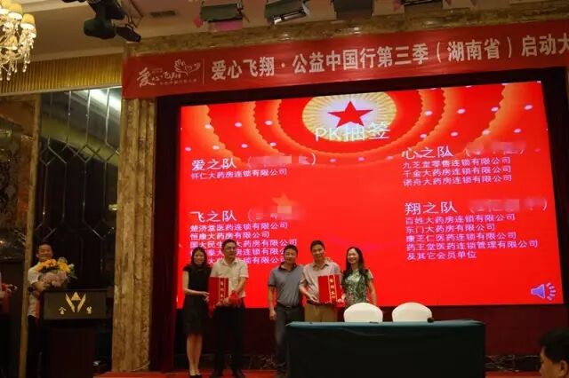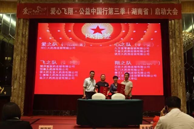 何家巨、山东宏济堂制药集团有限公司销售总公司副总经理董淑莲共同向林承雄、郭彩虹授湖南省省队队旗。湖南地区参与活动的医药连锁企业划分为湖南地区爱之队、心之队、飞之队、翔之队4支战队队伍,会上为各战队授旗,各战队队长签署活动责任状约定两两PK。各战队队长一致表示将不辱使命,在活动中展示湖南医药企业风采,积极为“爱心飞翔”第三季公益事业筹集善款,助力中国人道公益慈善事业。